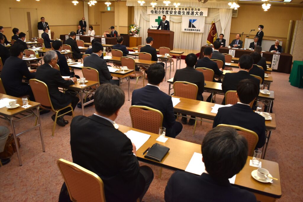 2026年4月16日(木)、札幌サンプラザにて、弊社安全衛生協力会定時総会および安全衛生推進大会を開催しました。大作社長より、「事故の多くは慣れた作業の中で起こる。日々のKY活動を形だけで終わらせず、基本動作を確実に積み重ねることが、無事故無災害への近道である」との挨拶がありました。続く安全講話では、札幌市保健福祉局ウェルネス推進部医療政策課様より、札幌市の救急医療体制に関する講義を受けました。